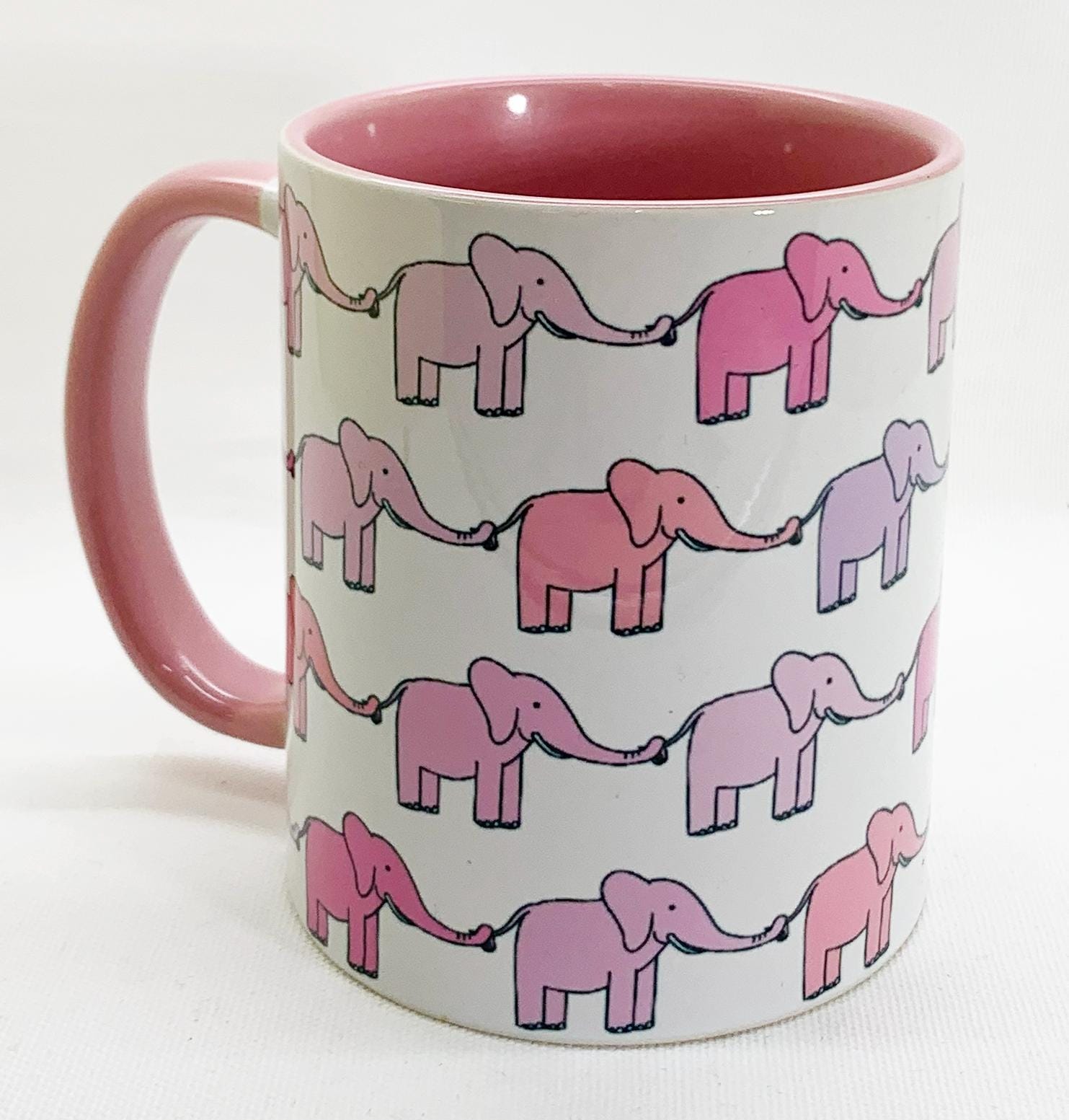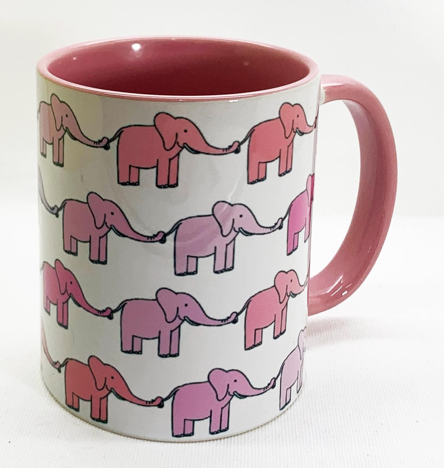 The Pink Elephants Mug with pink glazed handle and inner by Half a Donkey. Featuring lines pf baby elephants in pink, with their trunks holding the tails of the elephant in front, so they don;t get lost. Designed and printed in Britain. A high quality ceramic mug which is both dishwasher and microwave proof. Height 9.5cm Diameter 8.2 cm, with a capacity of 310ml (11oz)). From the Series 6 Animals Range by Half A Donkey