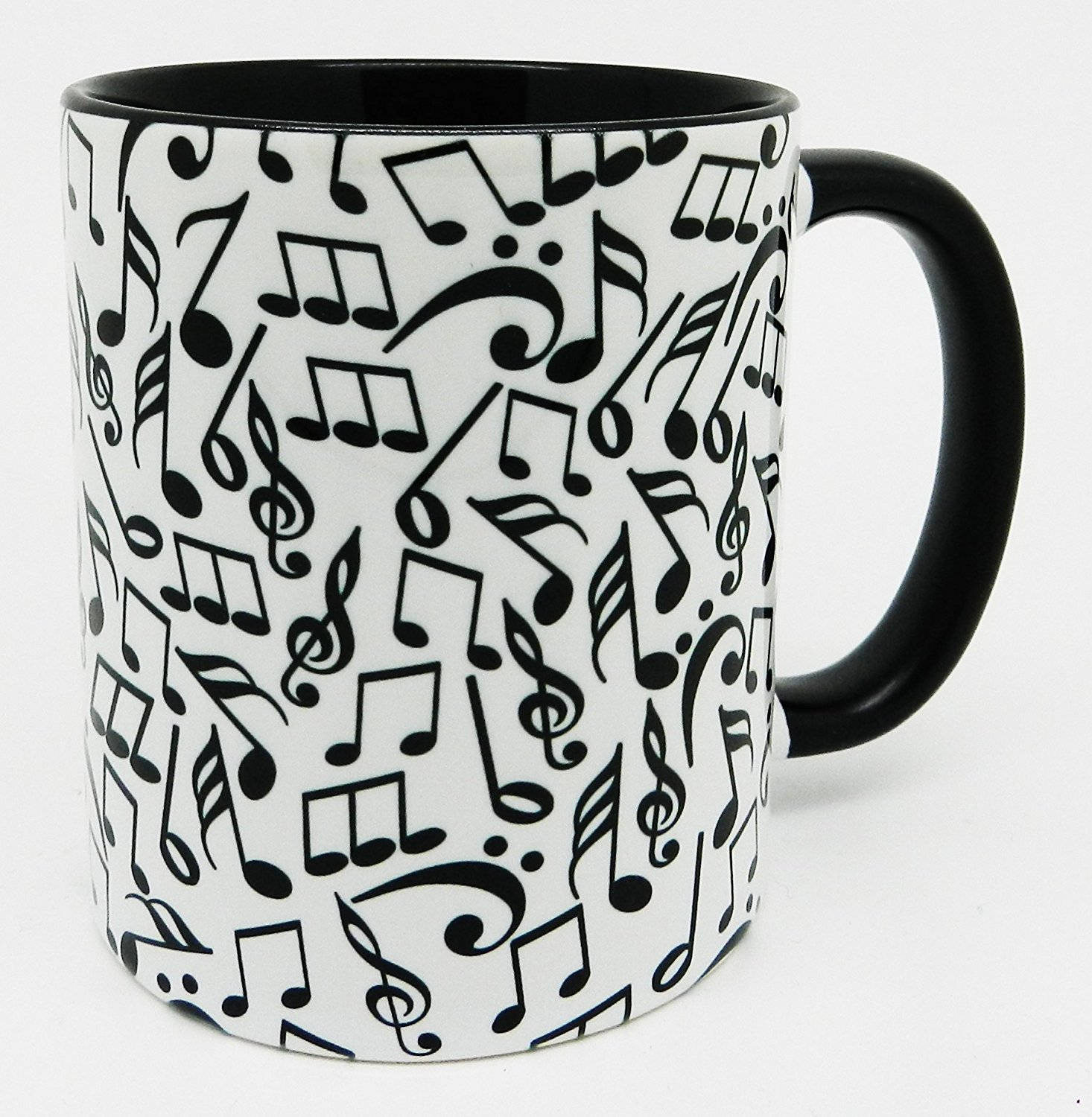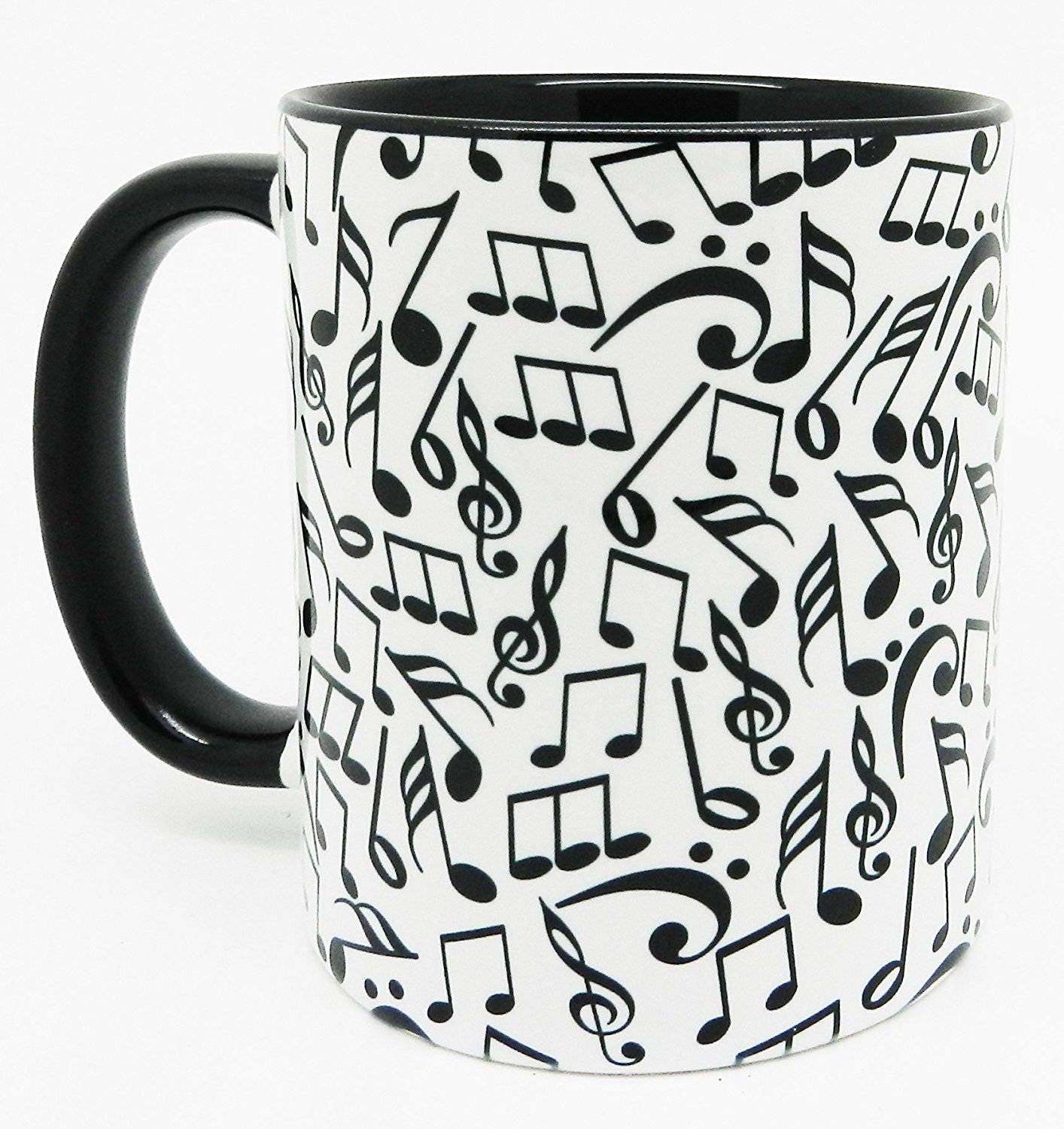The Musical Notes Mug with black glazed handle and inner. A jumble of traditional musical notes designs. A high quality ceramic mug, with black handle and innerf. Height 9.5cm Diameter 8.2 cm Capacity is 310ml (11oz). From the Series 1 Original Line Range by Half a Donkey Ltd.