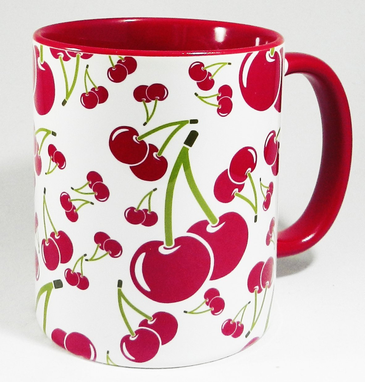 The Red Cherries Mug with glazed red handle and inner by Half a Donkey . Bright red pairs of cherries, freshly picked and still on their stalks. High quality ceramic mug Height 9.5cm Diameter 8.2 cm Capacity is 310 ml (11oz). From the Series A Food and Drink Range by Half a Donkey Ltd.